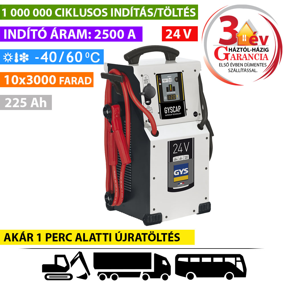 24 V-os (2 x 12 V) akkumulátorral szerelt járművekhez: nehéz tehergépjárművek, buszok, stb. A GYSCAP 24V szuperkondenzátor technológiát használ (akkumulátorok nélkül), hogy azonnali indítási teljesítményt biztosítson. Járó motorral rendelkező járműből származó energiát használ fel, hogy automatikusan feltöltse magát. Ezt az energiát egy másik jármű indítására használja fel. Ez a készülék teljesen autonóm, és nem kell a hálózathoz csatlakoztatni.