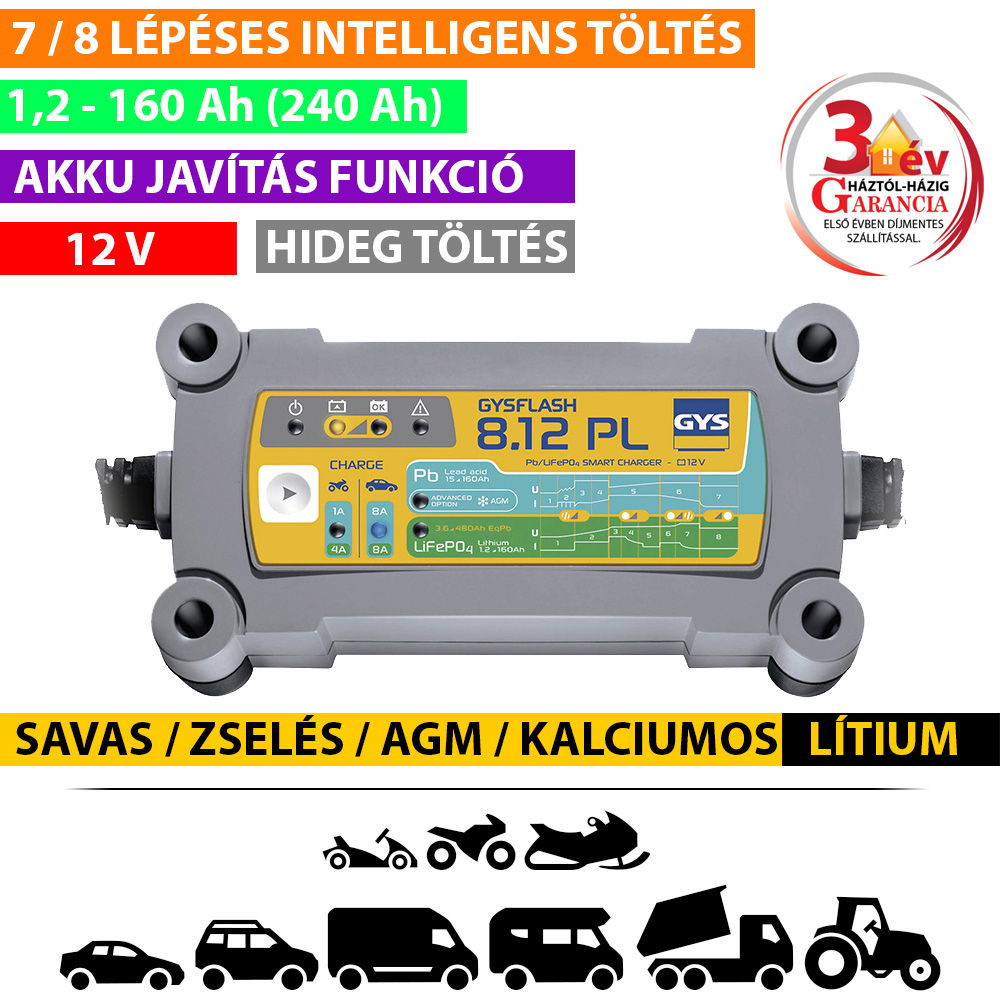 Pb: minden 12 V-os ólom-savas akkumulátor töltéséhez 15 Ah-tól 160 Ah-ig.