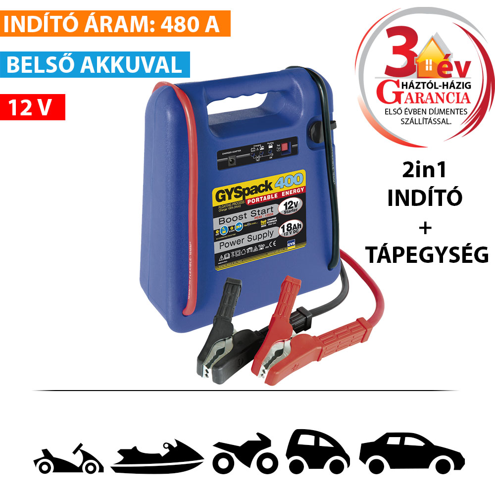 A GYSPACK 400 azonnal beindítja az autókat, lakókocsikat, kisteherautókat (indítóáram 480 A / csúcsáram 1200 A).